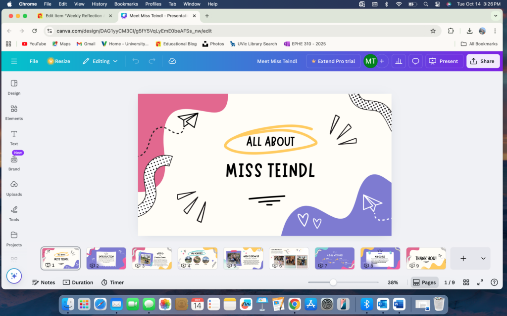 In class we were given a design challenge to create a graphic that could be shared on our blogs!! Below is an example of an Introduction slide I created on myself. I chose a free template and added my own photos, widgets and text.