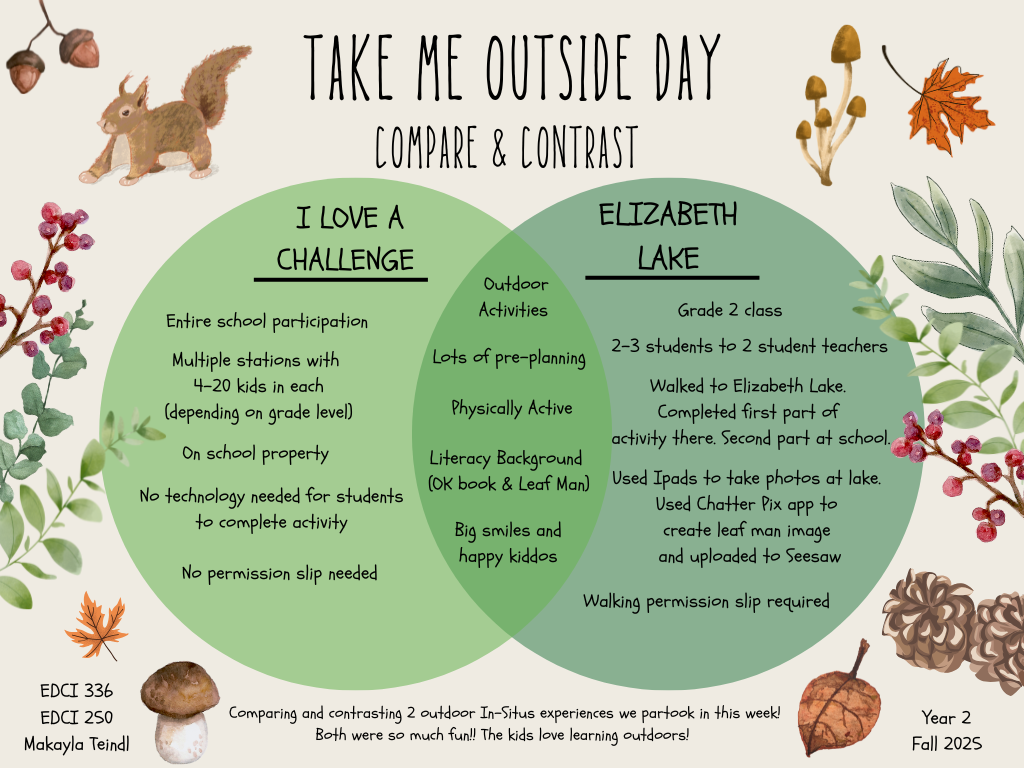 Below is a comparison and contrast of both days that I made in Canva! I really enjoyed both in situ opportunities! It’s always so meaningful when we can spend time with the students, learning from them and their teachers!! I think Take Me Outside Day is definitely something worth bringing awareness to. If I could share one major takeaway from these experiences, it would without a doubt be that students are far more engaged when they can be outside and active!! I will definitely take advantage of the beautiful place we call home and teach outdoors as much as possible!!